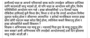 “यसै बिच सामाजिक संजालको प्रयोग गर्दै देशका कुना-कुनाबाट बिद्यार्थीका अभिभावले समेत शिक्षक आन्दोलनलाई पुर्ण समर्थन र सफलताको शुभकामना दिईरहेका छन्”, एक आन्दोलनरत शिक्षकले जानकारी दिनु भयो।