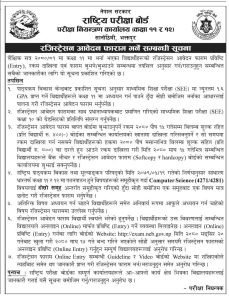 राष्ट्रिय परिक्षा वोर्ड परिक्षा नियन्त्रण कार्यालयले कक्षा ११ का विद्यार्थीहरुकालागी रजिष्ट्रेशन आवेदन फाराम भर्ने सुचना प्रकाशन गरेको छ । मिती २०८० मंशिर २० गते बाट खुल्ला गरिएको आवेदन फाराम भर्ने मिती २०८० माघ १५ सम्म जनाएको छ । जसमा मंशिर मसान्त सम्म प्रति विद्यार्थी ४०० र मसान्त पछि माघ १५ सम्म ८०० विलम्व शुल्क निर्धारण गरेको छ ।