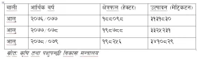 मुलुकमा स्वदेशी आलुको उत्पादन र क्षेत्रफल बढ्दो छ । आर्थिक वर्ष २०७८/०७९ मा १ लाख ९८ हजार क्षेत्रफलमा गरिएको आलु खेतीबाट ३४ लाख १० हजार मेट्रिक टन आलु उत्पादन भएको थियो । यस्तै, आव ०७७/०७८ मा १ लाख ९८ हजार हेक्टर क्षेत्रफलमा गरिएको आलु खेती ३३ लाख २५ हजार मेट्रिक टन उत्पादन भएको थियो । यस्तै, आव २०७६/०७७ मा १ लाख ८८ हजार हेक्टर क्षेत्रफलबाट ३१ लाख ३१ हजार मेट्रिक टन आलु उत्पादन भएको थियो । यी उत्पादनबाट बजार के–कति आलु आउने यकिन तथ्यांक नरहेको जनाइएको छ ।