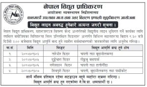 बिहान ९ः३० देखि दिउँसो २ बजेसम्प विद्युत आपूर्ति बन्द हुनेछ ।