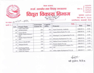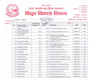 विद्युत विकास विभागले लाइसेन्स लिएर काम अगाडि नबढाएका जलविद्युत आयोजनासँग प्रगति विवरण मागेको छ। लाइसेन्स लिएर ५ वर्षभन्दा बढी समयसम्म काम गर्न नसकेका ५५ वटा आयोजनासँग प्रगति विवरण मागिएको हो। आयोजना निर्माण गर्न सक्ने स्पष्ट आधार र कार्ययोजना नभेटिए लाइसेन्स खारेज गर्ने तयारी छ।