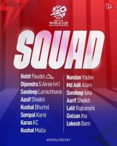काठमाडौँ । टी-२० विश्वकप छनोट खेल्ने नेपाली राष्ट्रिय क्रिकेट टोलीको घोषणा भएको छ। नेपाल क्रिकेट संघ क्यानले २०२६ को टी-२० विश्वकप खेल्ने एसिया तथा इस्ट एसिया प्यासिफिक छनोटका लागि नेपाली राष्ट्रिय टोली घोषणा भएको छ।