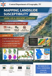 काठमाडौं । काठमाडौंस्थित Tribhuvan University अन्तर्गतको Central Department of Geography (CDG) द्वारा आयोजना गरिएको तीन दिने ‘Training on Machine Learning in Python and ArcGIS Application’ तालिम सफलतापूर्वक सम्पन्न भएको छ। विभागको आफ्नै GIS तथा Remote Sensing Centre मा आयोजित उक्त तालिम अप्रिल २२ देखि २४, २०२६ सम्म सञ्चालन गरिएको थियो, जसले सहभागीहरूलाई आधुनिक भू-स्थानिक प्रविधिमा दक्ष बनाउने उद्देश्य राखेको थियो।