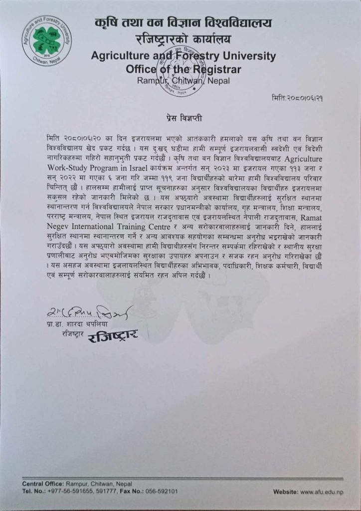 कृषि विश्वविद्यालयबाट इजरायल गएका १ सय १९